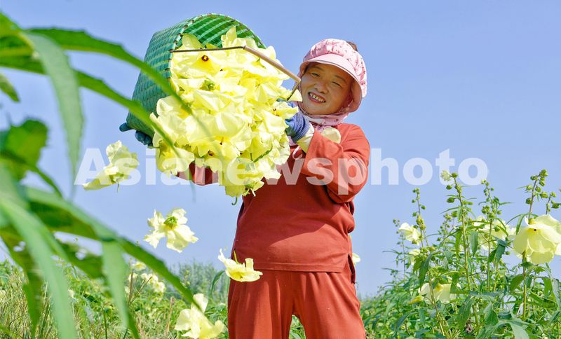 2024年9月4日,江苏省海安市墩头镇千步村季家家庭农场黄蜀葵种植基地,农民正忙着采收黄蜀葵花。黄蜀葵花是一种中药材,花期较长,采收期可达100天左右。近年来,当地农民因地制宜种植黄蜀葵,亩产效益是传统粮食作物的3倍左右。