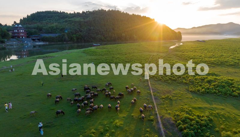 图片说明:2024年9月4日,在四川省南充市蓬安县相如街道油房沟社区,牛群在江心岛上吃草。