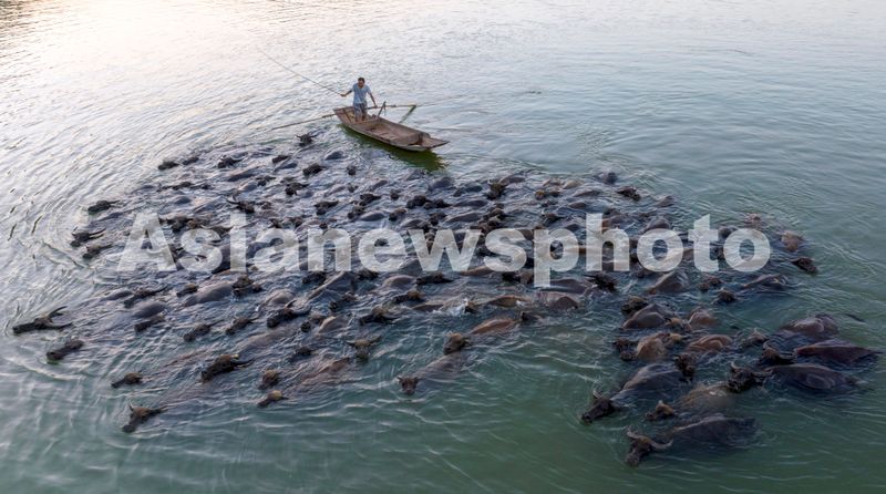 图片说明:2024年9月4日,在四川省南充市蓬安县相如街道油房沟社区,牛群横渡嘉陵江游回归栏。