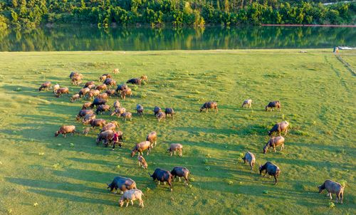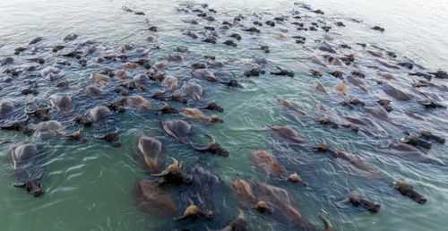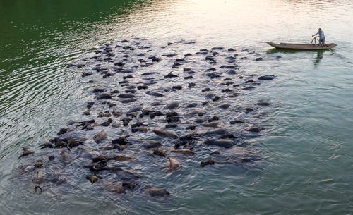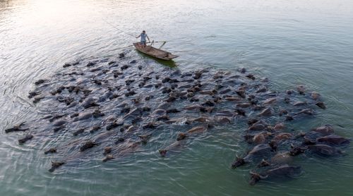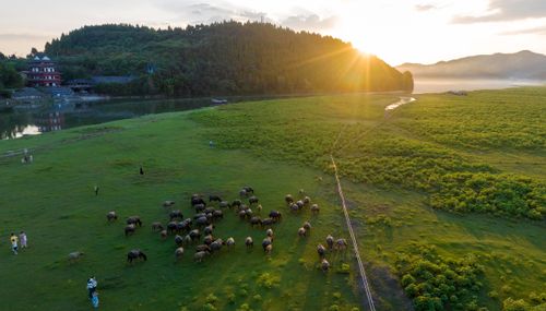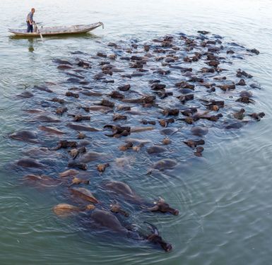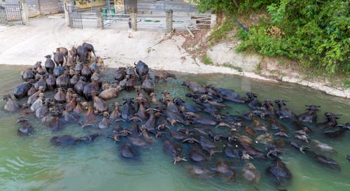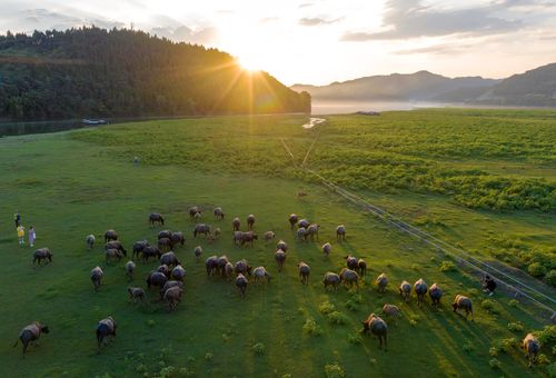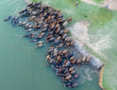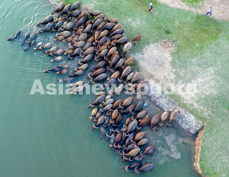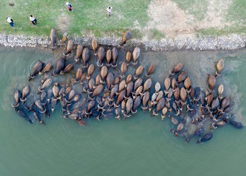 图片说明:2024年9月4日,在四川省南充市蓬安县相如街道油房沟社区,牛群从江心岛下水准备游回归栏。