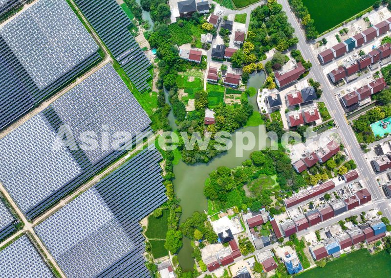 2024年9月6日,从空中俯瞰湖州市长兴县吕山乡雁陶村,村庄、鱼塘、光伏基地相互映衬,共绘出一副美丽生态乡村画卷。