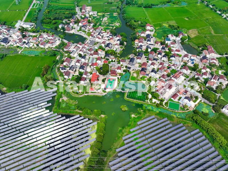 2024年9月6日,从空中俯瞰湖州市长兴县吕山乡雁陶村,村庄、鱼塘、光伏基地相互映衬,共绘出一副美丽生态乡村画卷。