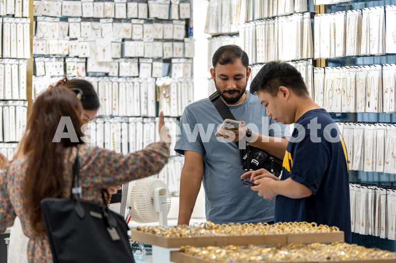 图片说明:2024年9月9日,浙江金华义乌国际商贸城里,外国客商在选购商品。