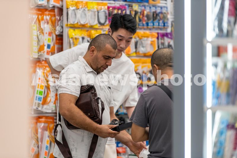 图片说明:2024年9月9日,浙江金华义乌国际商贸城里,外国客商在选购商品。
