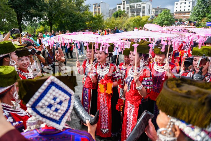 图片说明:9月10日,苗族同胞在贵州省黔西南布依族苗族自治州兴仁市屯脚镇鲤鱼村迎宾。