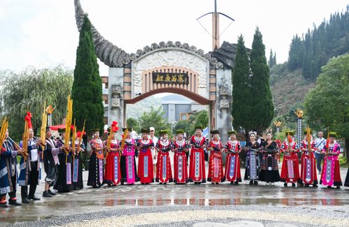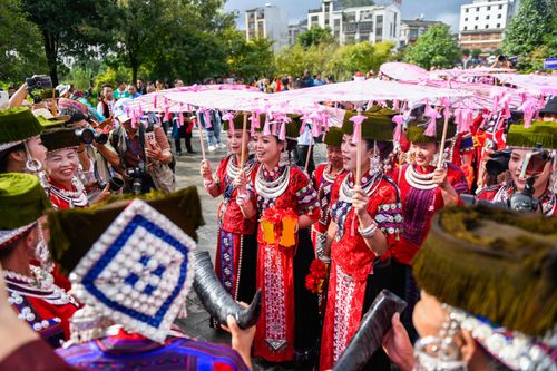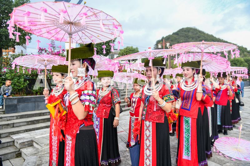 图片说明:9月10日,苗族同胞在贵州省黔西南布依族苗族自治州兴仁市屯脚镇鲤鱼村参加苗族“八月八”风情节巡游展示。