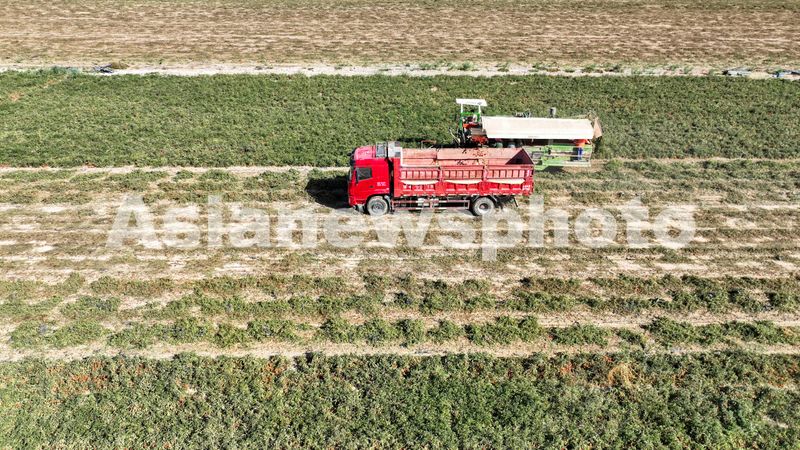 2024年9月9日,在甘肃西域阳光食品有限公司东坝农场的千亩番茄地上,大型番茄采收机与拉运车密切配合,在田间穿梭,采收、拉运番茄,现场一派丰收景象。