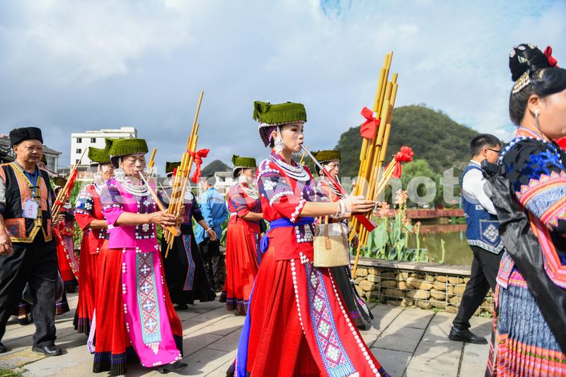 图片说明:9月10日,苗族同胞在贵州省黔西南布依族苗族自治州兴仁市屯脚镇鲤鱼村参加苗族“八月八”风情节巡游展示。