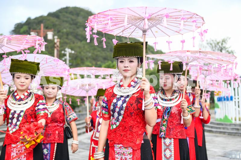 图片说明:9月10日,苗族同胞在贵州省黔西南布依族苗族自治州兴仁市屯脚镇鲤鱼村参加苗族“八月八”风情节巡游展示。