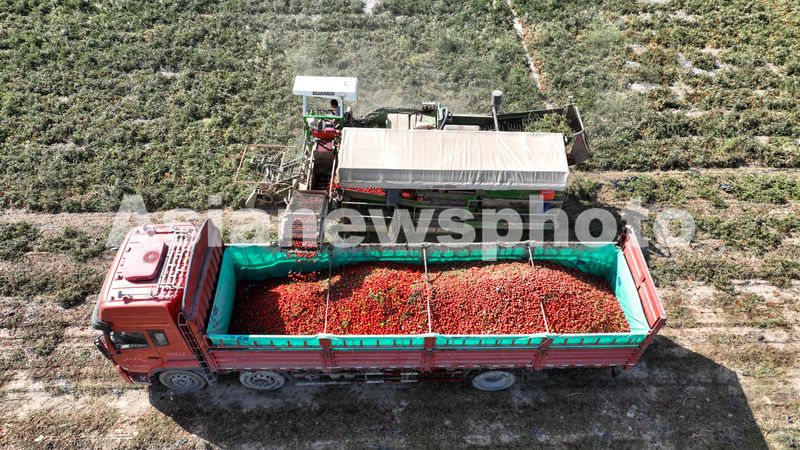 2024年9月9日,在甘肃西域阳光食品有限公司东坝农场的千亩番茄地上,大型番茄采收机与拉运车密切配合,在田间穿梭,采收、拉运番茄,现场一派丰收景象。