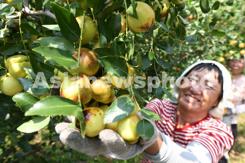 2024年8月30日,农户在安徽省阜阳市颍泉区枣树行种植专业合作社“玉铃铛”枣基地采摘成熟的“玉铃铛”枣。
