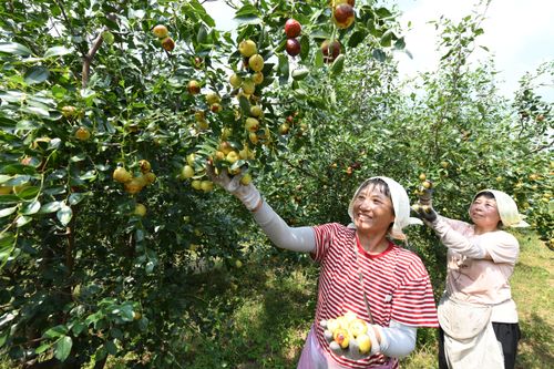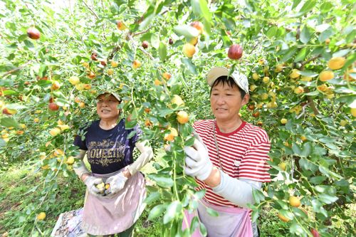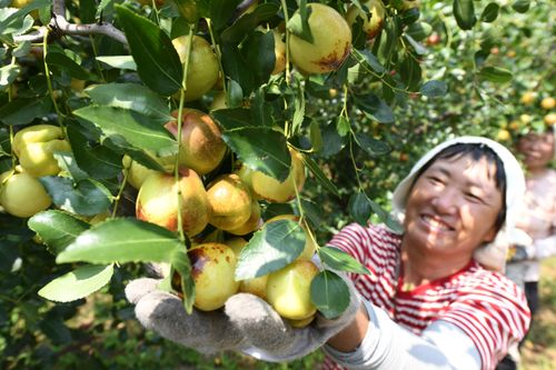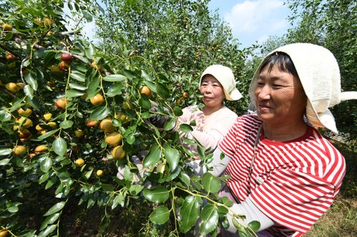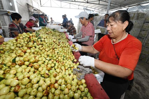2024年8月30日,农户在安徽省阜阳市颍泉区枣树行种植专业合作社“玉铃铛”枣基地采摘成熟的“玉铃铛”枣。目前,合作社加村民种植的“玉铃铛”枣已达2500余亩。不断扩大的种植规模,在让村民们提“枣”增收的同时,也提供着越来越多的就业岗位。