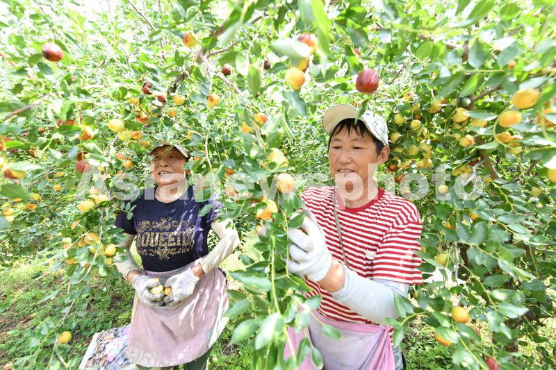 2024年8月30日,农户在安徽省阜阳市颍泉区枣树行种植专业合作社“玉铃铛”枣基地采摘成熟的“玉铃铛”枣。