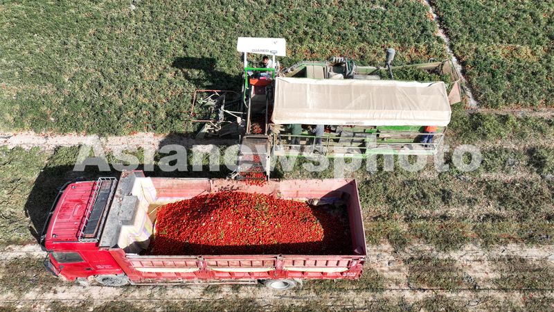 2024年9月9日,在甘肃西域阳光食品有限公司东坝农场的千亩番茄地上,大型番茄采收机与拉运车密切配合,在田间穿梭,采收、拉运番茄,现场一派丰收景象。