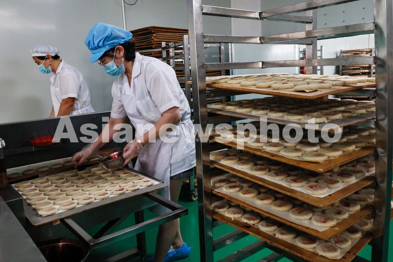 2024年9月10日,位于浙江省义乌市义亭镇的义乌市供销食品有限公司月饼生产车间内,工人们正在赶制非遗传统土月饼,供应中秋节市场。