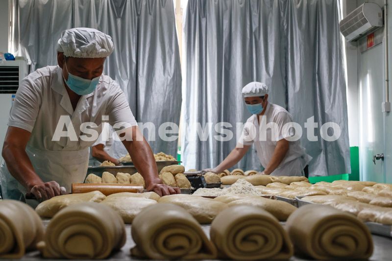 2024年9月10日,位于浙江省义乌市义亭镇的义乌市供销食品有限公司月饼生产车间内,工人们正在赶制非遗传统土月饼,供应中秋节市场。
