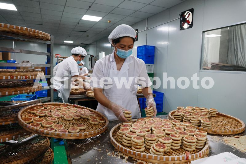 2024年9月10日,位于浙江省义乌市义亭镇的义乌市供销食品有限公司月饼生产车间内,工人们正在赶制非遗传统土月饼,供应中秋节市场。