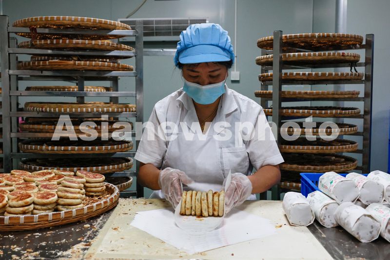 2024年9月10日,位于浙江省义乌市义亭镇的义乌市供销食品有限公司月饼生产车间内,工人们正在赶制非遗传统土月饼,供应中秋节市场。