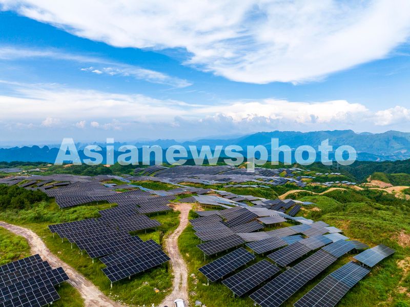 图片说明:2024年9月11日,广西梧州市蒙山县新圩镇山顶上的“茶光互补”光伏发电站。