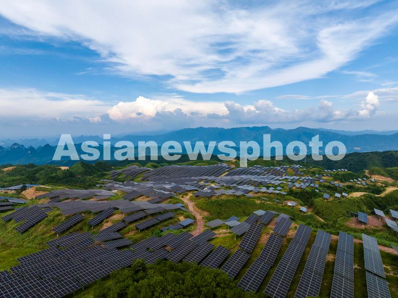 图片说明:2024年9月11日,广西梧州市蒙山县新圩镇山顶上的“茶光互补”光伏发电站。