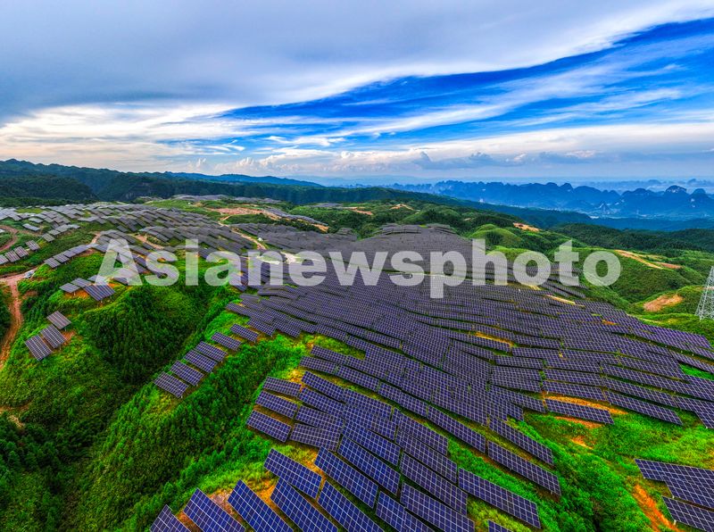 图片说明:2024年9月11日,广西梧州市蒙山县新圩镇山顶上的“茶光互补”光伏发电站。