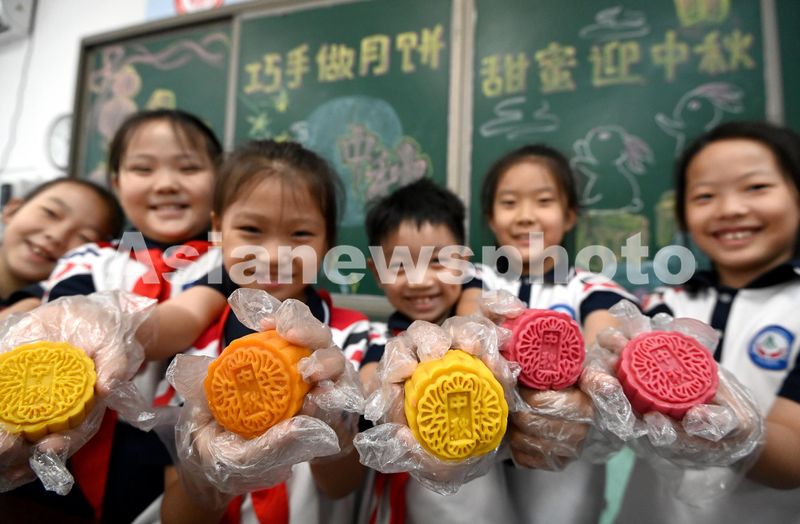 图片说明:9月13日,河北省邯郸市邯山区实验小学的学生们展示自己制作的月饼。