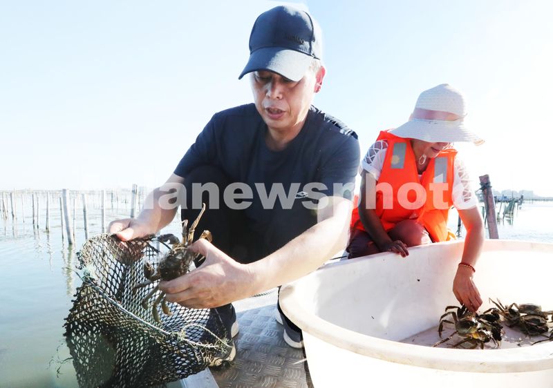 2024年9月13日,江苏省苏州市相城区清水村蟹农俞三男对其在阳澄湖莲花岛水域养殖的“阳澄湖1号”大闸蟹进行抽样起网测试。