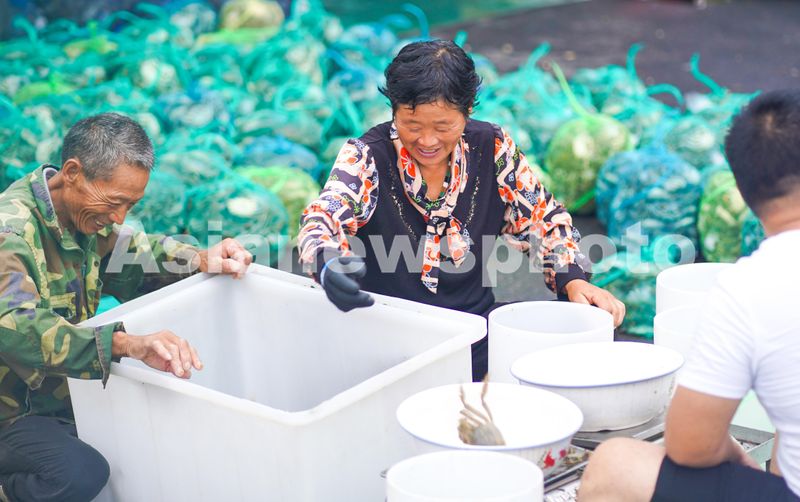 2024年9月13日,江苏省宿迁市宿城区中扬镇“霸王蟹”产业园,蟹农正在对螃蟹进行分拣、称重,准备销往市场。