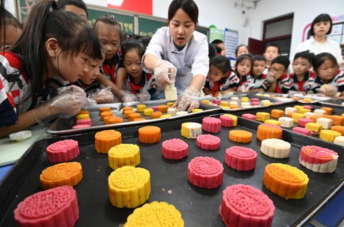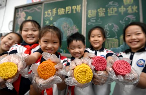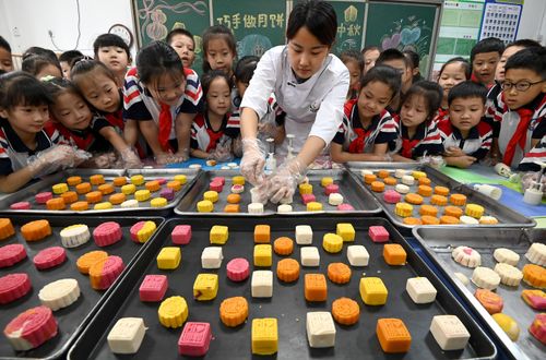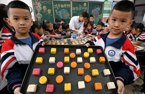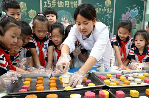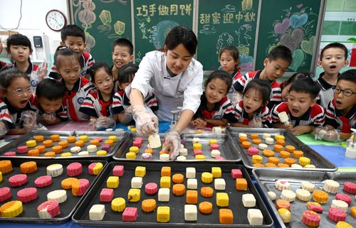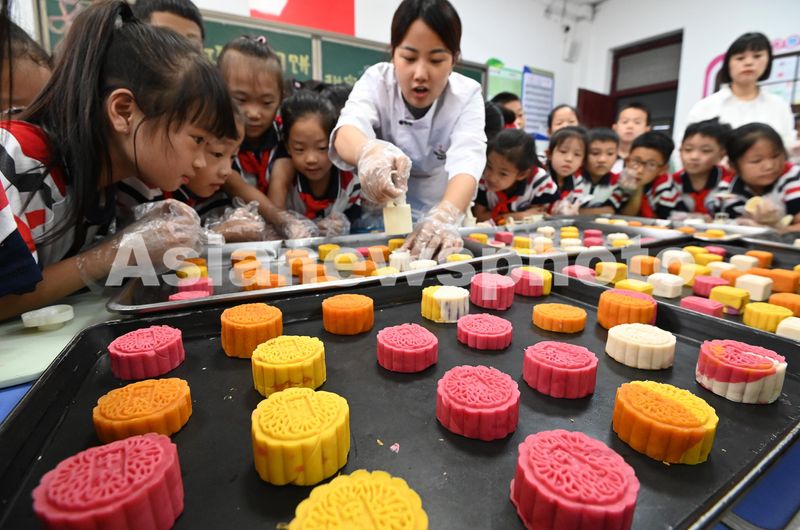 图片说明:9月13日,在河北省邯郸市邯山区实验小学,面点师教学生们制作月饼。