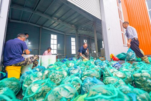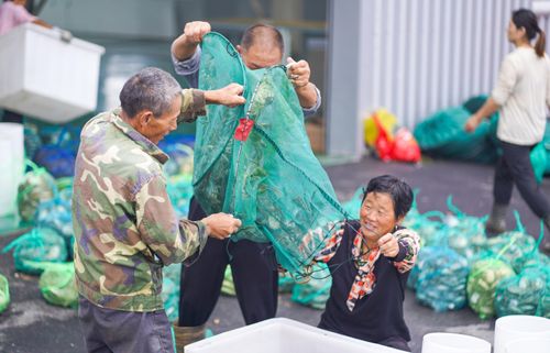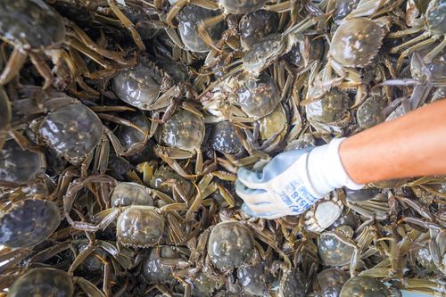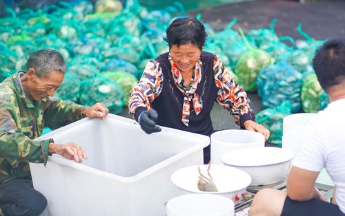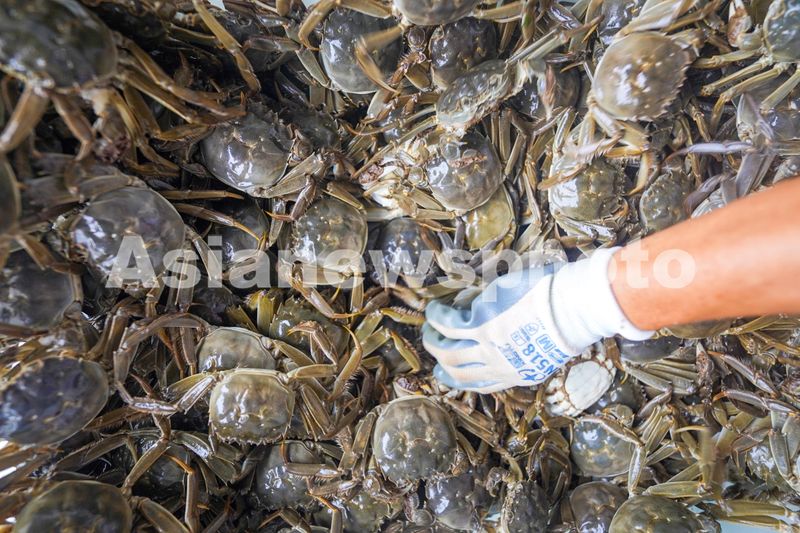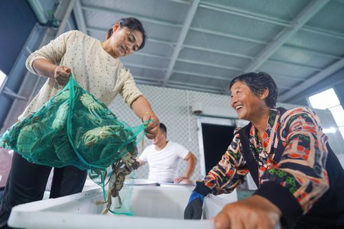 2024年9月13日,江苏省宿迁市宿城区中扬镇“霸王蟹”产业园,蟹农正在对螃蟹进行分拣、称重,准备销往市场。