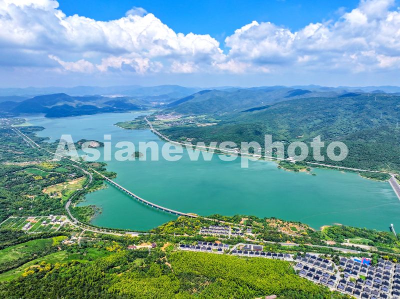 2024年9月15日,浙江省湖州市长兴县小浦镇合溪水库与村庄、青山、道路相映成趣,构成一幅风光旖旎、生态秀美的壮丽画卷。长兴县小浦镇合溪水库是一座集供水、灌溉、生态等综合利用为一体的水利民生工程,自建成以来保障生活用水,减少洪涝灾害,妆点了秀美的生态画卷。