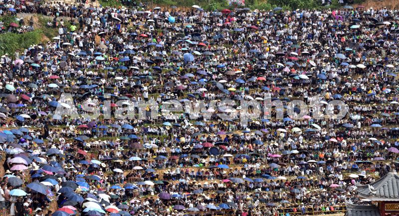 图片说明:2024年9月15日,人们在贵州省黔东南苗族侗族自治州从江县丙妹镇仟伍牛塘观看斗牛。