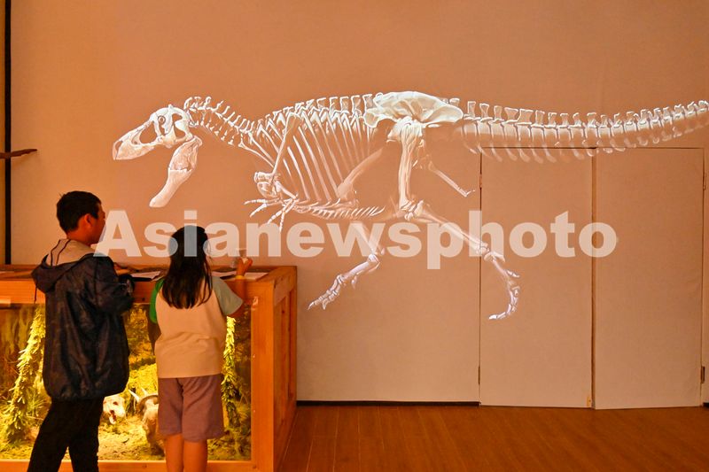 2024年9月16日,小朋友在山东省青州市举办的仿真恐龙展上参观。