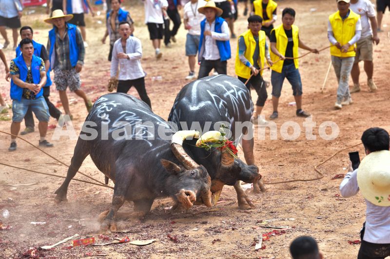 图片说明:2024年9月15日,在贵州省黔东南苗族侗族自治州从江县丙妹镇仟伍牛塘,两头牛王正在比赛。