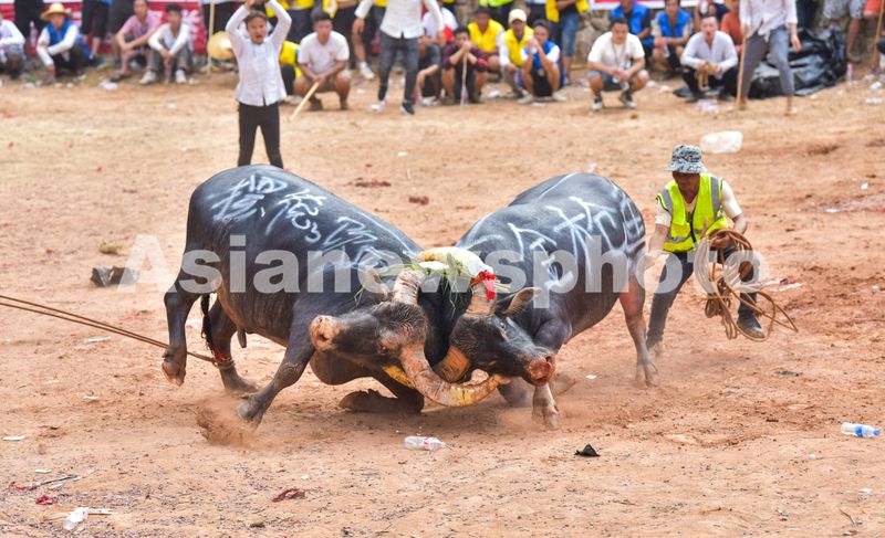 图片说明:2024年9月15日,在贵州省黔东南苗族侗族自治州从江县丙妹镇仟伍牛塘,两头牛王正在搏斗。