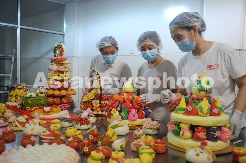 图片说明:2024年9月18日,员工正在淄博阳妈五彩食品有限公司制作花馍。