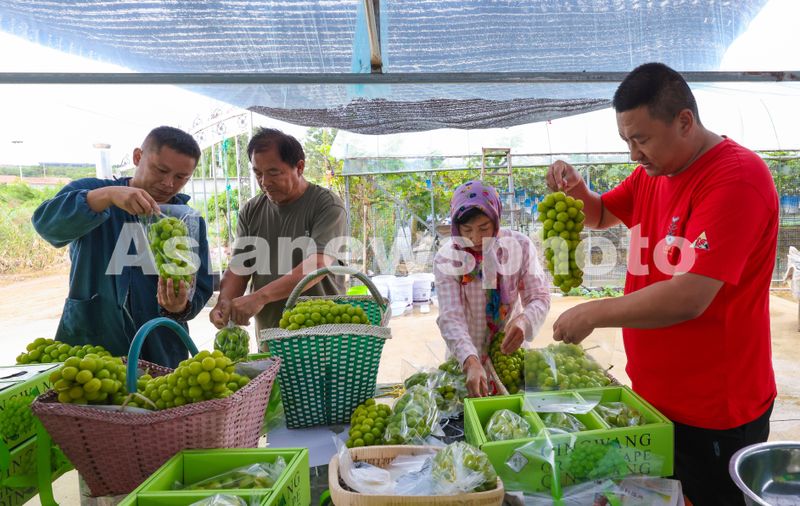 图片说明:2024年9月16日,山东省烟台市福山区东厅街道潘家泊村,合作社社员们把葡萄包装成礼盒。