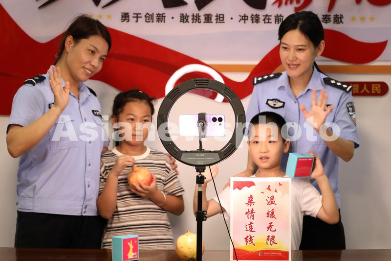 2024年9月17日,江苏省宝应县公安局夏集派出所民警与留守学生通过网络与远在外地务工的父母视频通话,送上中秋节祝福。