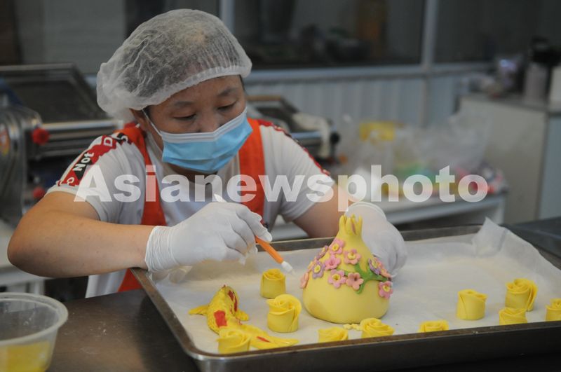图片说明:2024年9月18日,员工正在淄博阳妈五彩食品有限公司制作花馍。