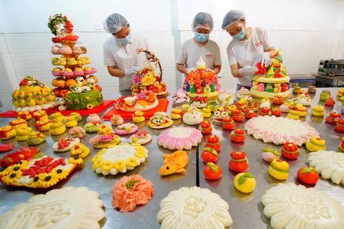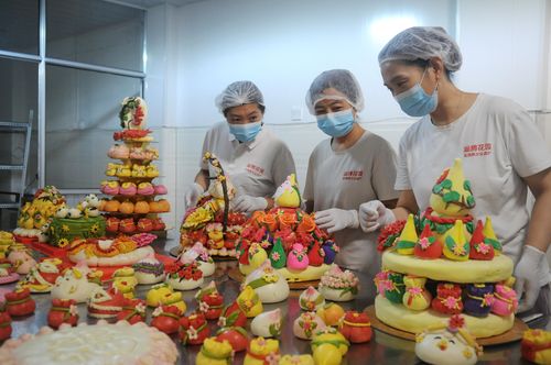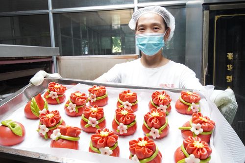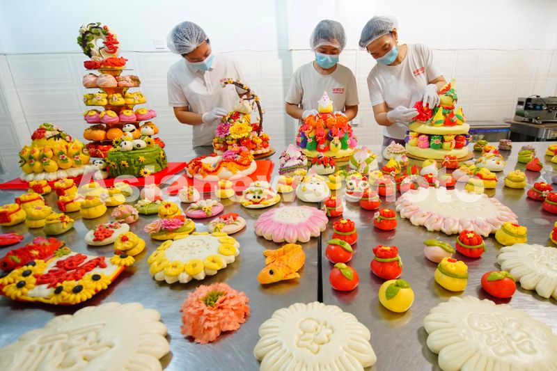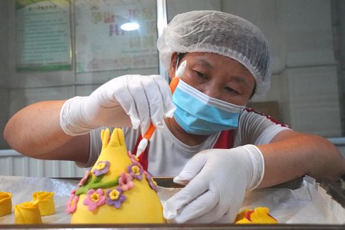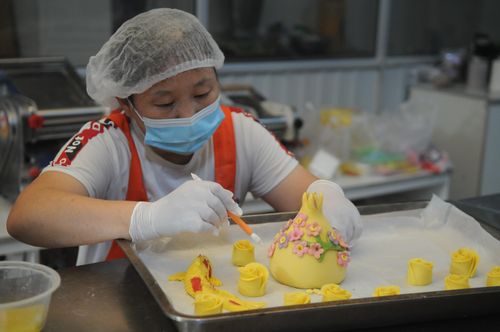 图片说明:2024年9月18日,员工正在淄博阳妈五彩食品有限公司制作花馍。