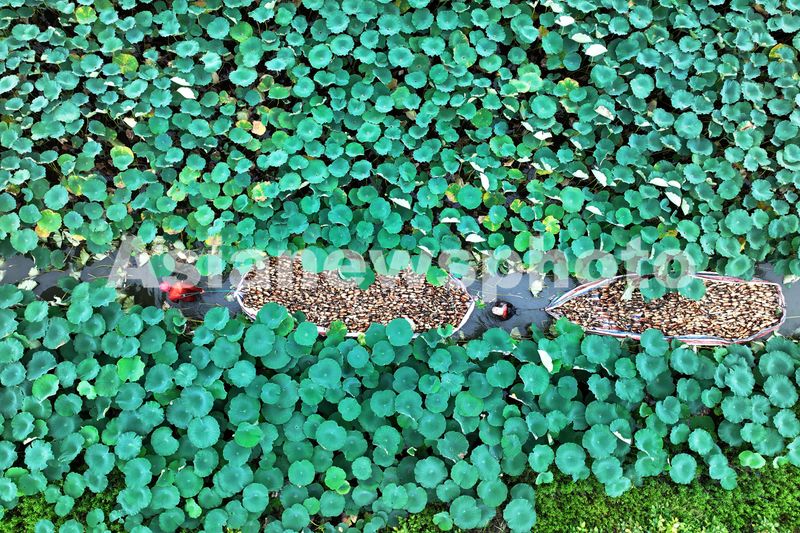 图片说明:2024年9月18日,在宝应县夏集镇苏雅村,农民在藕田里采收荷藕。