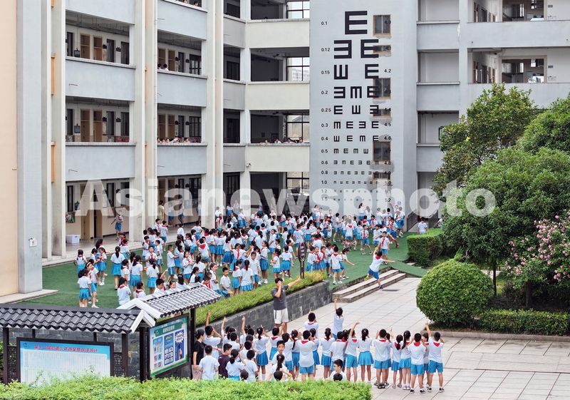 图片说明:2024年9月19日,浙江省东阳市吴宁一校教学楼墙壁上,一个巨大的视力表映入眼前,许多学生在此观摩,有的学生顺手就对着视力表进行了视力测试。