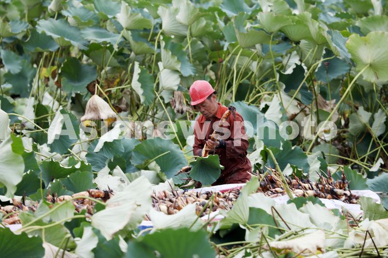 图片说明:2024年9月18日,在江苏省宝应县夏集镇苏雅村,农民在藕田里采收荷藕。