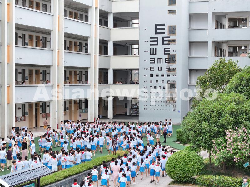 图片说明:2024年9月19日,浙江省东阳市吴宁一校教学楼墙壁上,一个巨大的视力表映入眼前,许多学生在此观摩,有的学生顺手就对着视力表进行了视力测试。