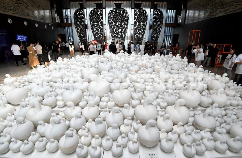 图片说明:9月20日,参观者在“磁·引力—2024中国(峰峰)磁州窑国际陶瓷艺术双年展”上参观。