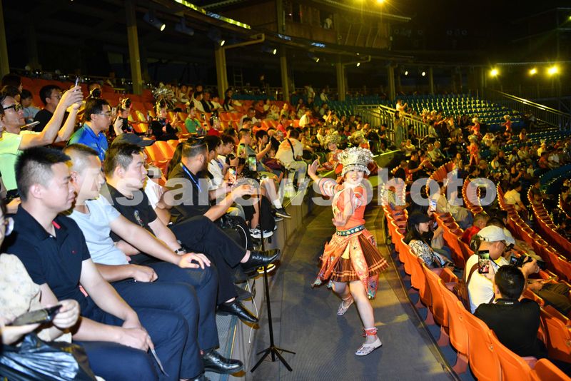 2024年9月20日,演员在贵州省求黔东南苗族侗族自治州雷山县大塘镇剧场表演苗族歌舞诗剧《仰欧桑》中与观众互动。