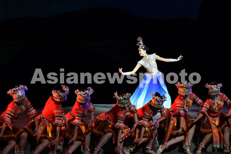 2024年9月20日,演员在贵州省求黔东南苗族侗族自治州雷山县大塘镇剧场表演苗族歌舞诗剧《仰欧桑》。