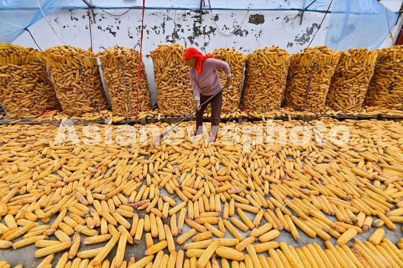 2024年9月21日,山东省青州市黄楼街道后坡村农民在晾晒玉米。