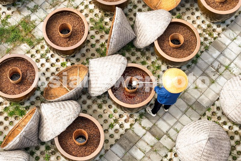 2024年9月21日,滕州市鼎盛酿造有限责任公司的工人在晾晒场上浇淋晒制酱油。
