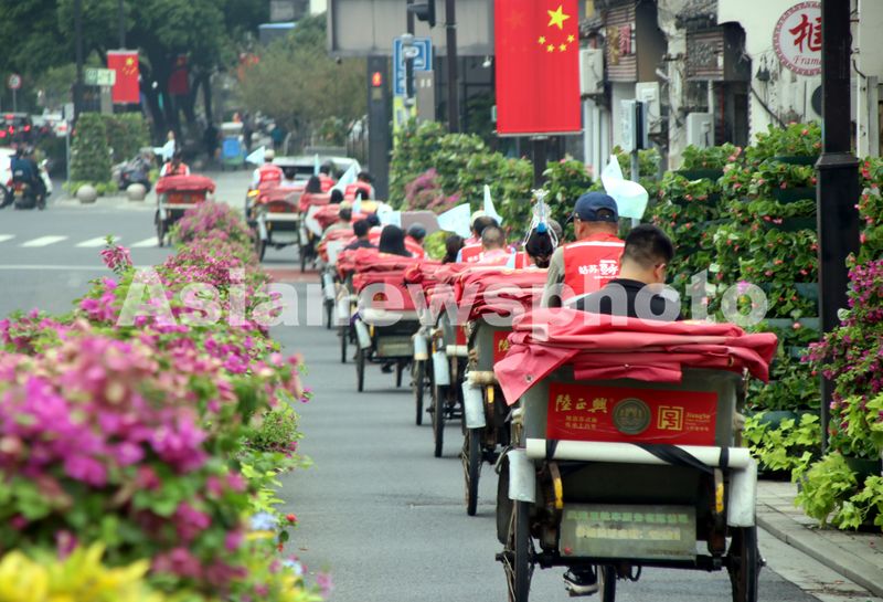 图片说明:2024年9月25日,载着游客的三轮车队行驶在江苏省苏州市姑苏区街头。